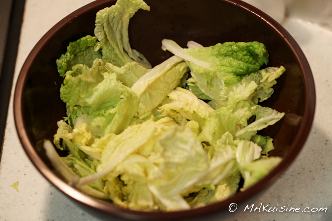 Couper le chou grossièrement, le laver, l'essuyer et le mettre dans un saladier avec un peu de sel. Bien remuer.